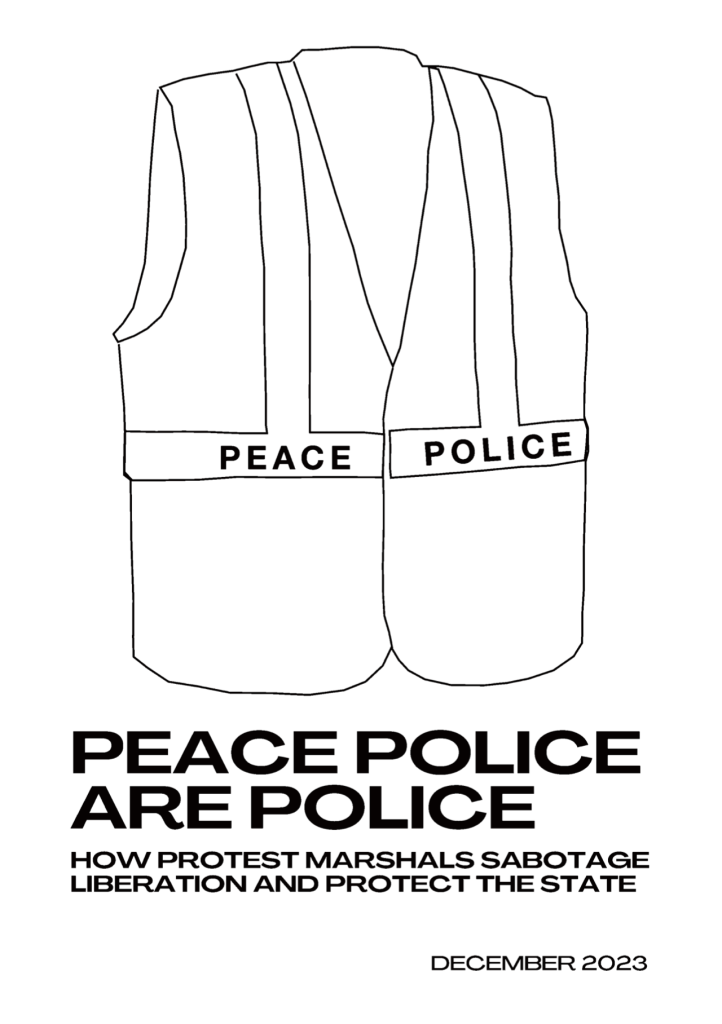 This is a term for individuals whose self-appointed role at political demonstrations is to regulate the conduct of protestors in the name of “protecting” them, serving as the police’s representatives within the crowd. We call these practices policing because that is their function. Peace policing strips protests of power. Peace policing is also tactically dangerous. This is where the figure of the protest marshal comes in. Protest marshals are an extension of riot police. Protest marshals are the police state’s keffiyeh-wearing (“safe, welcoming physical presence” as the Department of Justice puts it) front line against the people. Peace policing is a weapon of counterinsurgency. The goal is to divert, redirect, and contain the people’s insurgent energy into protests that the state can tolerate.
